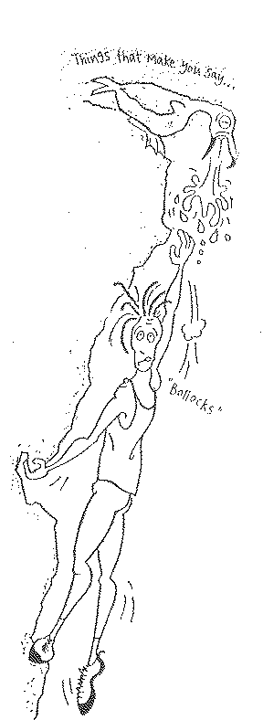 Meanwhile Gary was having a storming day with an impressive lead of South East Diedre (HVS), Richard was knocking off lots of VS's (the epic brothers in fine form). Nick made an interesting lead of an adjacent VS by missing out the easy arete and taking the lay back flake (graded How Fucking Stupid?). Pete followed up the sensible way. Back to Rhossili for large amounts of Guinness. After a dinner of Squeezy cheesy peas we R.V'd at the local pub. The local Young Farmers were having a disco, this ended at 9:45 and a severely pissed tosser came flying into the pub convinced that the chair that had just floored him was put there by me, he then threatened me with the aforementioned chair (luckily for him I did not have to unleash the power of my turning kick) Gary gave him a Rupert Bear stare and he sodded off (another victory for SOUTH LONDON!). Back at the campsite, smokes and dreams of green plastic watering cans.