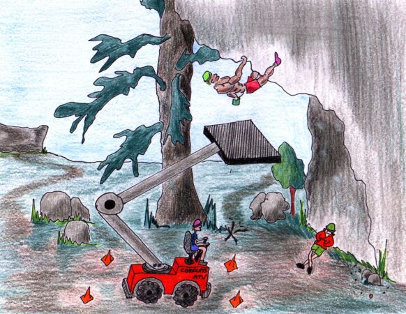 Most notably, rock climbers have adapted the sport to liven up dull descent paths after completing a climb. One enthusiast, Eddie Church of EGCC, “It’s sometimes a pain climbing an overhang with your board strapped to your back but it gives you a good adrenalin rush on the way down. The descent from the Dinas Cromlech was the best yet. I’d fitted the latest 40-spoke wheels with all-terrain Vertical-Pro 2.5” knobbly tyres, set a pressure of 2 bar to get the best grip possible on the scree, suspension travel was set to the max and I’d removed the board stiffers just in case. I was doing OK until I got near the road and noticed a bus coming down the hill. Wow man I pooped me pants, flipped a grind on the first boulder and cleared the road, dry stone wall and the river in one go. Unfortunately I landed in a bog the other side and it took Adrian 20 minutes to dig me out—cor what a smell. Yeah, a rush man!!!”